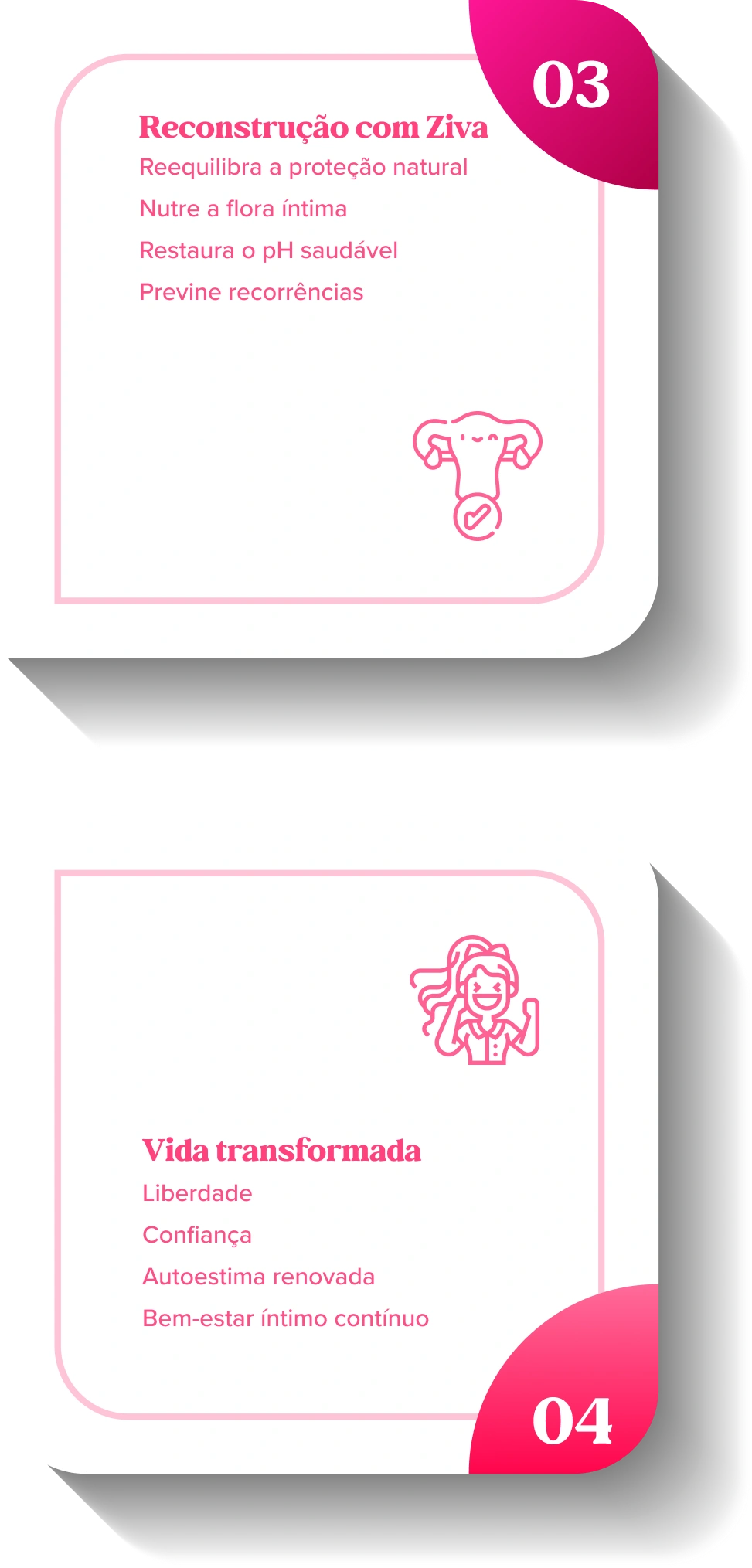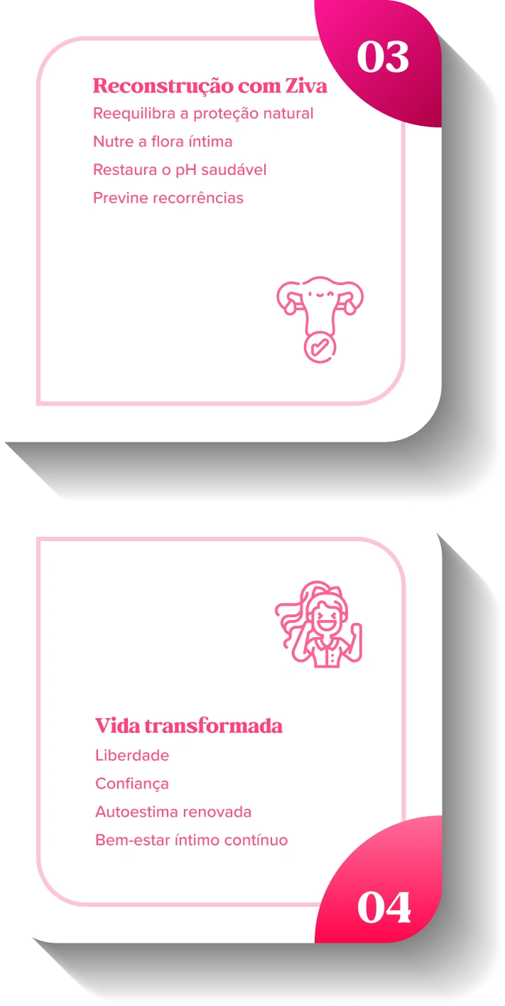 Remédios aliviam, mas não reconstroem. Sem restaurar sua flora íntima, o ciclo continua. A Ziva vai direto na causa: nutre e reequilibra sua proteção natural de forma rápida e eficaz.