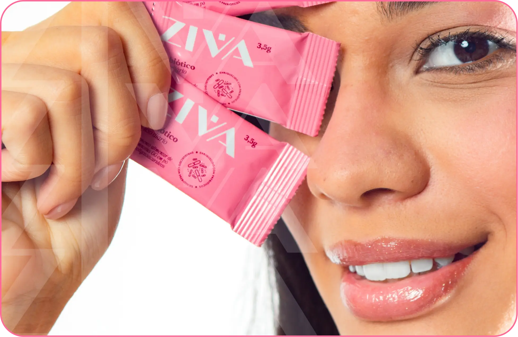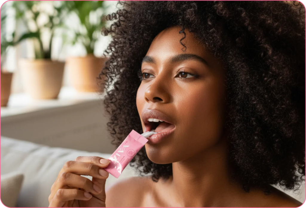 Ziva é diferente de tudo: é o primeiro simbiótico íntimo em pó com sabor de algodão doce que você toma direto na boca e traz alívio real de dentro pra fora.